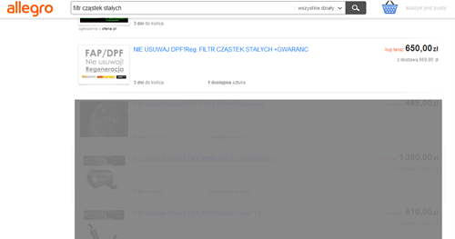 Na Allegro można spotkać nasze aukcje proponujące usługę regeneracji dpf i fap. Niestety na Allegro można też znaleźć mnóstwo ofert proponujących usuwanie dpf, które jest bardzo ryzykowne.