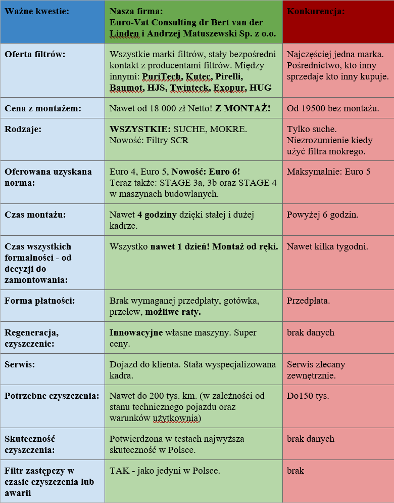 Nasza firma jako jedyna w Polsce oferuje filtry większości producentów oraz zapewniamy szybki montaż, zieloną plakietkę i załatwienie niezbędnych formalności oraz obsługę gwarancyjną i pogwarancyjną (to bardzo ważne, bo filtry cząstek stałych trzeba regenerować, czyścić, a nasza firma jest wyróżniona za jedną z najlepszy regeneracji dpf i fap).