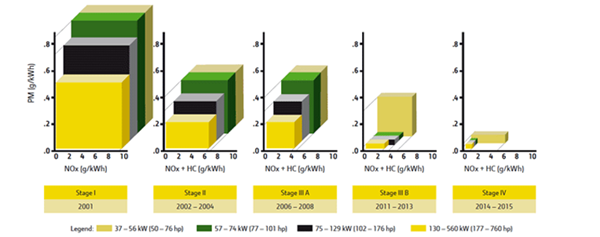 Pierwsze normy emisji spalin dla silników wysokoprężnych o mocy powyżej 37 kW (50KM) stosowanych w pojazdach niedrogowych wprowadzono w 2001 roku (Stage 1). Następnie, określono bardziej rygorystyczne normy emisji spalin norma Stage II oraz norma Stage IIIA wprowadzane w latach 2002-2008. Norma emisji spalin Stage 4 obowiązuje od stycznie 2014